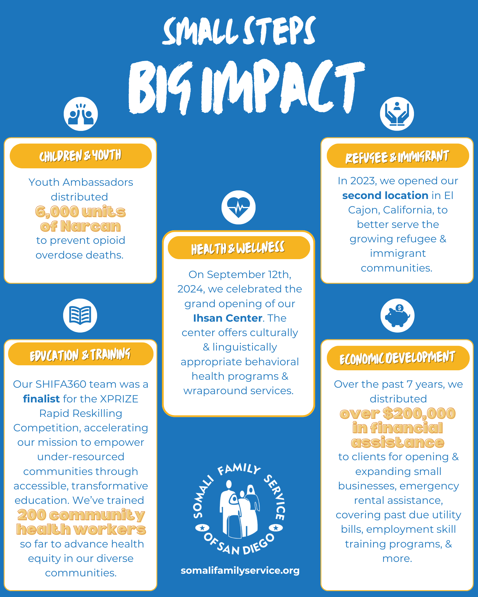 Somali Family Service has been serving immigrants, refugees, and other underserved populations for the past 25 years with support from our community champions. At least 10,000 people rely on our support each year to get connected to important resources, achieve self-sufficiency, and overcome barriers to accessing services.
